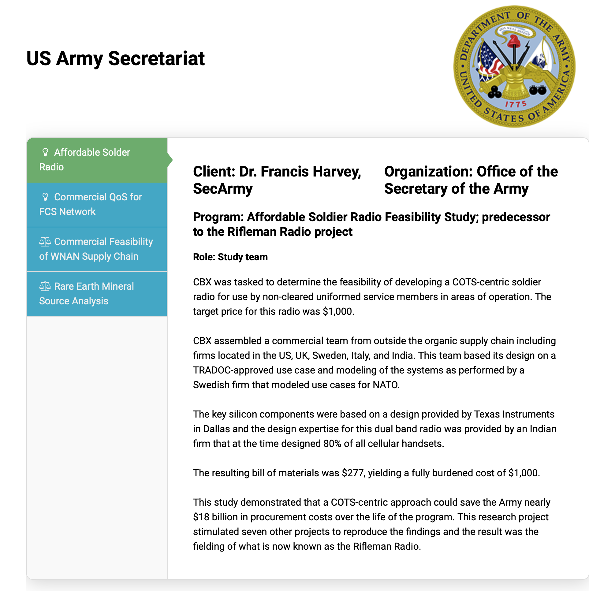On this page, we list 13 of our top projects and engagements. These include two projects (Affordable Soldier Radio and Vehicle Gas Consumption Analysis) that saved the Army $1 billion each in costs, one (Source Selection Evaluation of FFW Program) which introduced private-sector style due diligence to the process of evaluating two supply teams, each competing for a nearly $200 million contract, the evaluation of private sector technologies available to be used as a soldier-worn Body Personal Area Network, and many more.